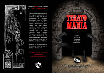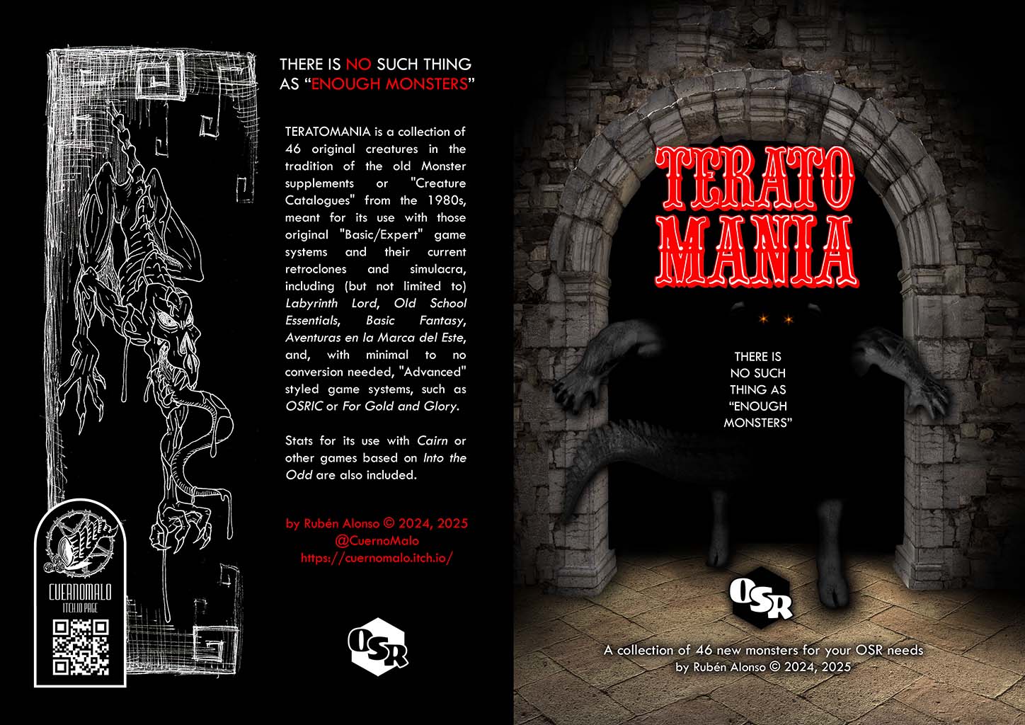 TERATOMANÍA es una colección de 46 criaturas originales en la tradición de los viejos suplementos de monstruos o “Creature Catalogues” de los años 80, ideadas para su uso con esos sistemas de juego “Básico/Experto” y sus actuales retroclones y similares, incluyendo (pero no limitado a) Labyrinth Lord, Old School Essentials, Basic Fantasy, Aventuras en la Marca del Este, y, con mínima o nula conversión necesaria, reglamentos de estilo “Avanzado”, como OSRIC o For Gold and Glory. También se incluyen estadísticas para su uso con Cairn u otros juegos basados en Into the Odd.